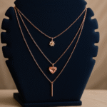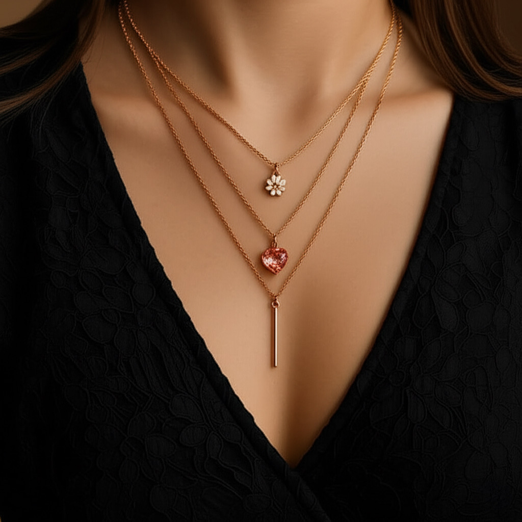- Embrace charm and romance with this triple-layered rose gold necklace set