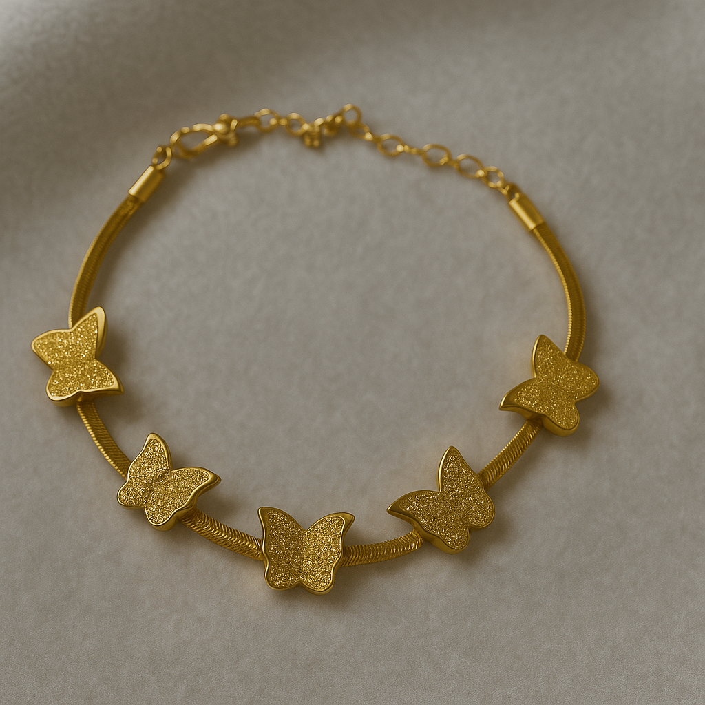 - A dreamy bracelet adorned with shimmering gold butterfly charms, symbolizing transformation and grace