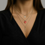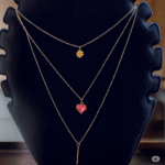• Soft and whimsical, this necklace combines a delicate daisy, a vibrant pink heart, and a slender bar pendant on fine gold chains