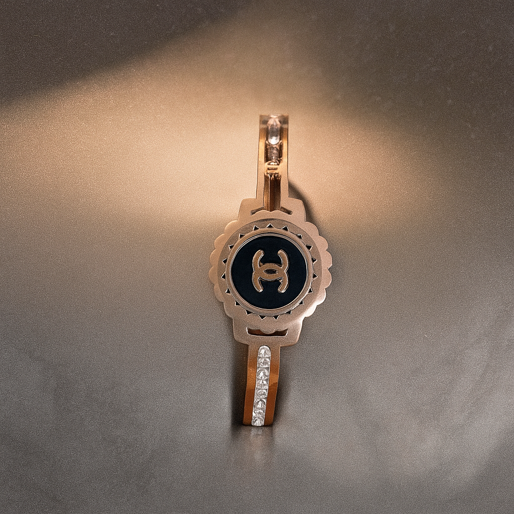- This rose gold bangle exudes royal charm with its crest-inspired centerpiece and sparkling crystal-studded band