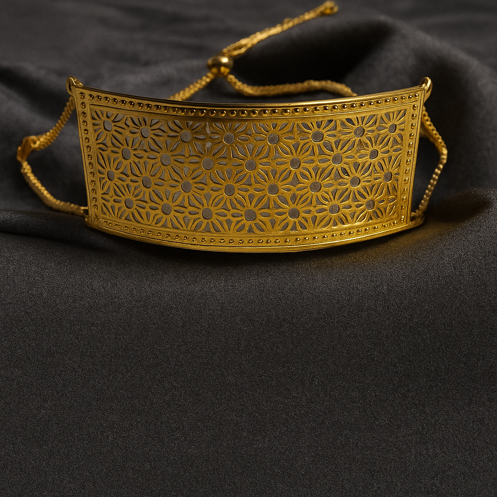 - Infused with timeless charm and intricate artistry, this gold plated bracelet features a captivating floral lattice pattern that symbolizes grace and femininity