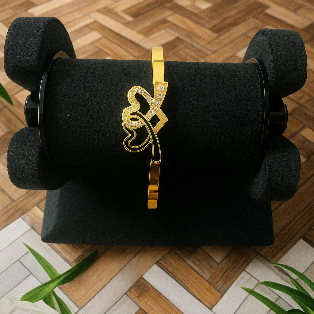 - A symbol of love and grace, this golden bracelet showcases an artistic heart-shaped bow accent adorned with delicate sparkling stones