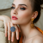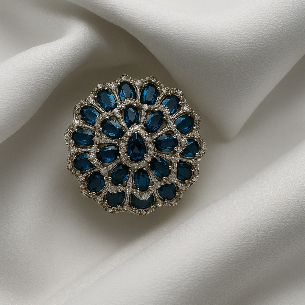 • This magnificent piece showcases a floral motif adorned with mesmerizing deep blue stones, beautifully contrasted by shimmering white accents that highlight its intricate design