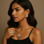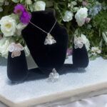 - The intricately designed floral pendant with matching earrings and a statement ring offers a fresh, graceful look—perfect for both contemporary and traditional outfits