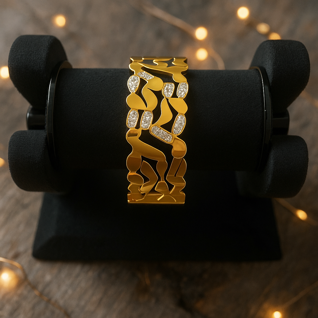 - Crafted with an artistic interplay of abstract shapes, the bracelet features shimmering pavé-set stones that catch the light with every movement